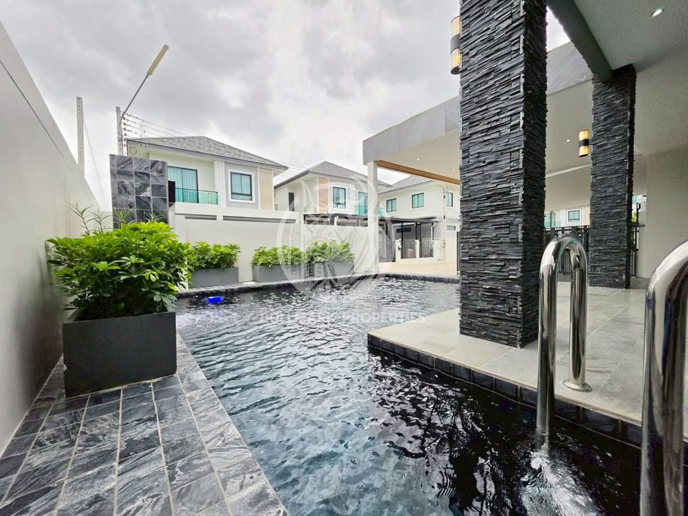 Discover your dream home in this exclusive 3-bedroom pool villa located at PMC Grand 9 in East Pattaya. Perfectly designed for modern living, this property boasts a generous living area of 180 sqm set on a well-sized land area of 188 sqm. Enjoy luxury with a private swimming pool, ideal for relaxation and entertainment. The villa features a spacious European kitchen, complete with an oven and microwave, making meal preparations a delight. Each bedroom is equipped with air conditioning for your comfort, and the bathrooms provide ample space for your needs. The amenities within the project further enhance your lifestyle. Indulge in the communal swimming pool, stay fit in the well-equipped gym, or enjoy quality time with your family at the children’s area. 24/7 security ensures peace of mind, while additional facilities like a guardhouse, CCTV, and laundry service cater to your everyday needs. Convenience is at your fingertips with a nearby convenience store and plenty of parking space available. This villa is not just a home; it's a lifestyle opportunity with high rental potential, perfectly situated near golf courses and public transport options. Experience the best of East Pattaya living in this serene and secure environment, where every detail is catered to your comfort and convenience.