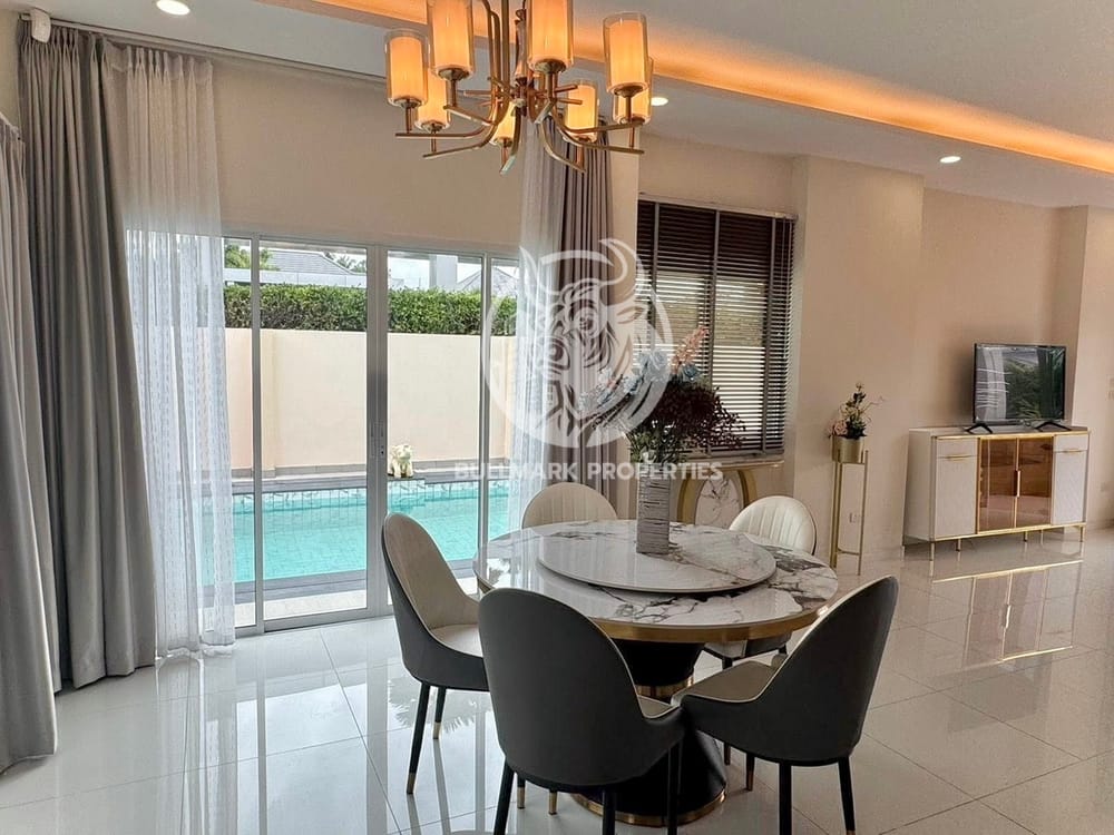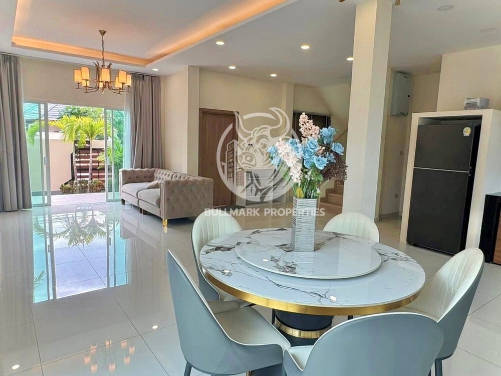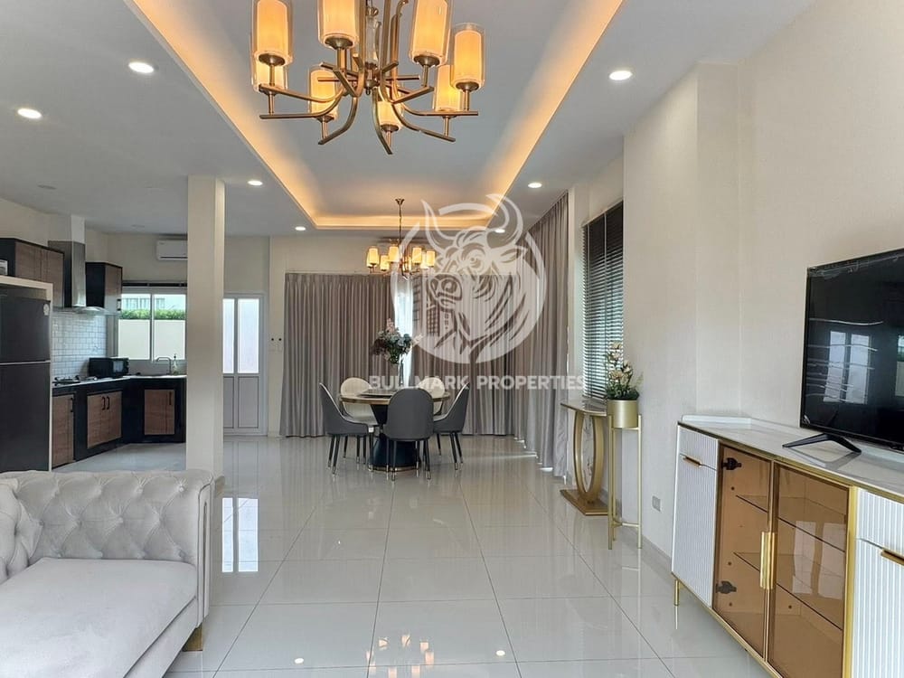 Welcome to your dream retreat in Huai Yai, Pattaya! This stunning pet-friendly 4-bedroom pool villa in Baan Dusit Garden offers the perfect blend of comfort and luxury. With a spacious living area of 280 sqm, this beautifully designed home features four well-appointed bedrooms, each with its own bathroom, providing ample space for family and guests. Enjoy modern conveniences such as air conditioning throughout, a European kitchen equipped with a kitchen hood, microwave, and washing machine, making meal prep a breeze. The villa is surrounded by a lovely garden, perfect for pets and outdoor relaxation, while the terrace invites you to unwind in the fresh air. The communal swimming pool is a highlight, offering a refreshing escape right at your doorstep. Safety and security are paramount with 24/7 security services and a guardhouse, ensuring peace of mind. Parking space is readily available, accommodating your vehicles with ease. The location boasts quick access to the main road and is near parks, shops, markets, schools, and a variety of restaurants. For golf enthusiasts, a prestigious golf course is just a stone's throw away. This is not just a home; it's a lifestyle offering convenience, tranquility, and everything your family needs to thrive. Don't miss out on this incredible opportunity!