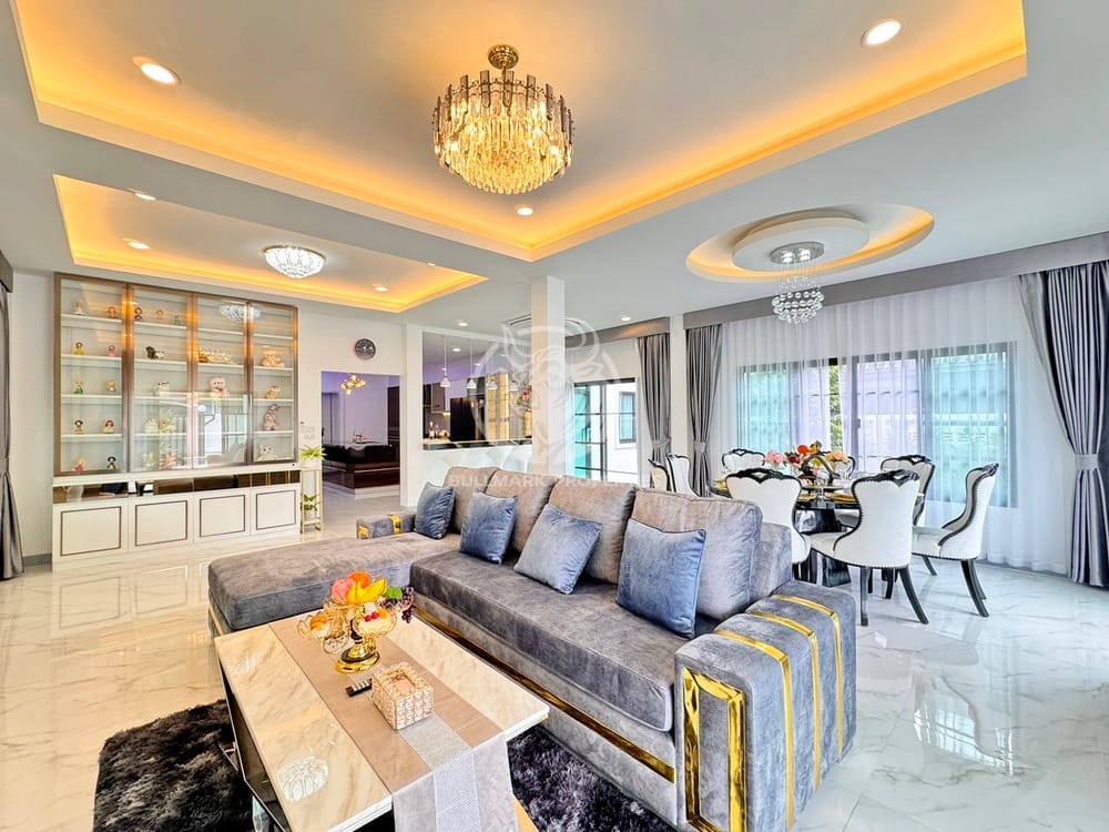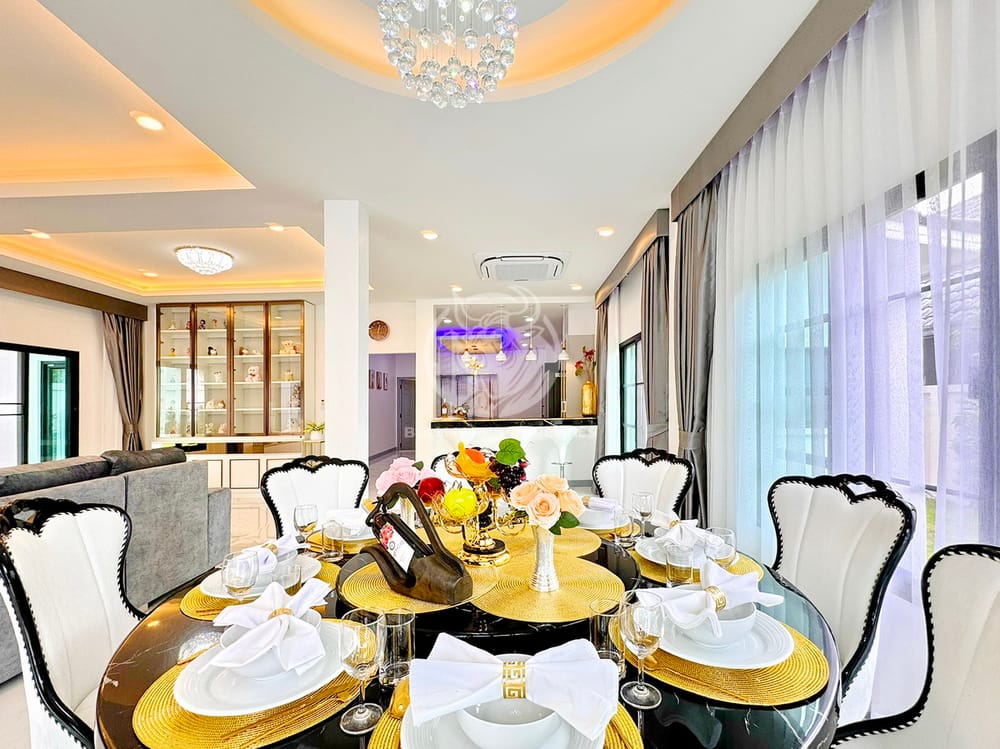 Discover your dream family home with this spacious 6-bedroom house for sale in East Pattaya. Perfectly designed for comfortable living, this property boasts a generous living area of 382 sqm and is situated on a 500 sqm land lot. The house features six well-appointed bedrooms and six modern bathrooms, making it ideal for large families or those who love hosting guests. Enjoy the convenience of a built-in European and Thai kitchen equipped with a kitchen hood, oven, microwave, and a washing machine. The open layout enhances the living space, leading seamlessly to a beautiful garden with a private swimming pool, ideal for relaxation and entertainment. Each room is air-conditioned for your comfort, and the property includes ample storage spaces and a dedicated service room. Step out onto the terrace or balcony to enjoy the serene surroundings. Perfectly located near the main road, this property provides easy access to parks, golf courses, shops, markets, schools, restaurants, and public transportation, including a nearby railway station. With 24/7 security, CCTV, and all essential utilities including water and electricity, this home offers both luxury and peace of mind. Don't miss the opportunity to own this exquisite family home in one of Pattaya's most desirable areas!