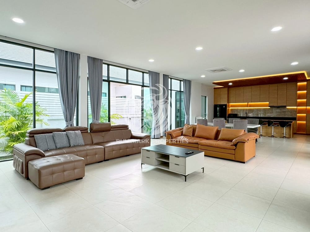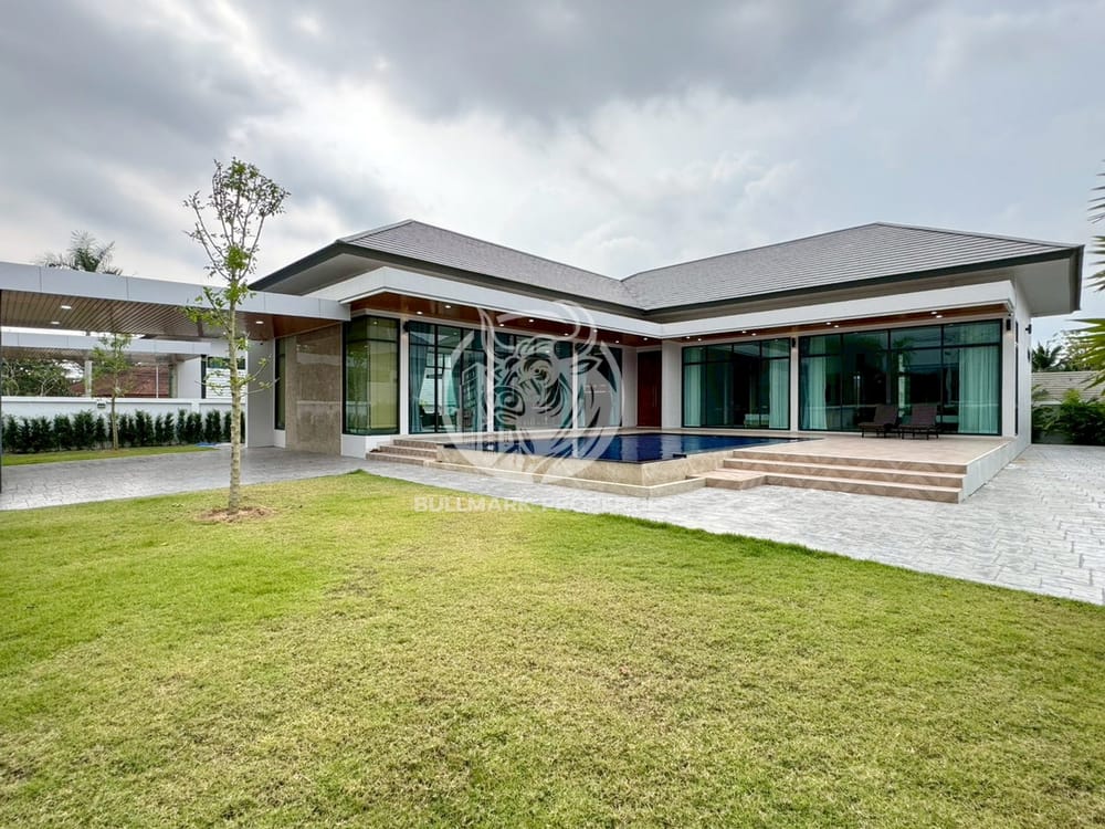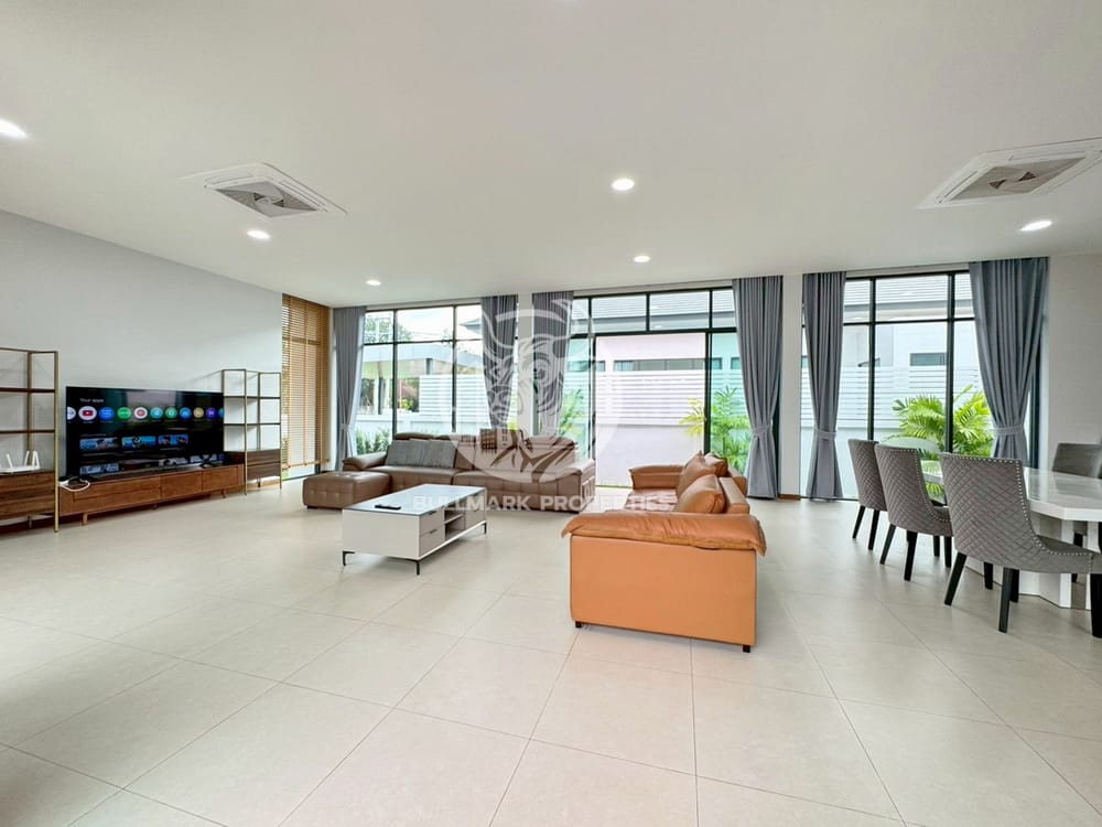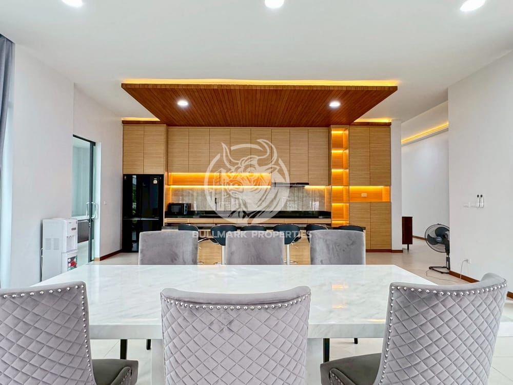 Discover this exquisite Luxury Pool Villa located in the serene area of Mabprachan Lake, East Pattaya, available for rent. Boasting 3 spacious bedrooms and 3 modern bathrooms, this villa offers a generous living area of 350 square meters, set on a sprawling land of 880 square meters. Ideal for families and pet lovers alike, the property is designed to provide comfort and elegance, complemented by a private swimming pool and lush garden space. The villa features a European kitchen and a traditional Thai kitchen, perfect for culinary enthusiasts. Enjoy modern conveniences such as air conditioning, high-speed internet, and a comprehensive alarm system for peace of mind. Entertaining is a breeze with a dedicated barbecue area and an expansive terrace that invites relaxation. This villa comes equipped with essential utilities including water tanks, electricity, and gas, ensuring a comfortable lifestyle. Additional highlights include a maid's room, laundry service, and a washing machine for added convenience. The location offers easy access to local amenities, being near shops, markets, schools, and hospitals, as well as recreational spaces like golf courses and parks. Safety is prioritized with CCTV surveillance in place. Experience luxury living with all the conveniences just a stone's throw away.